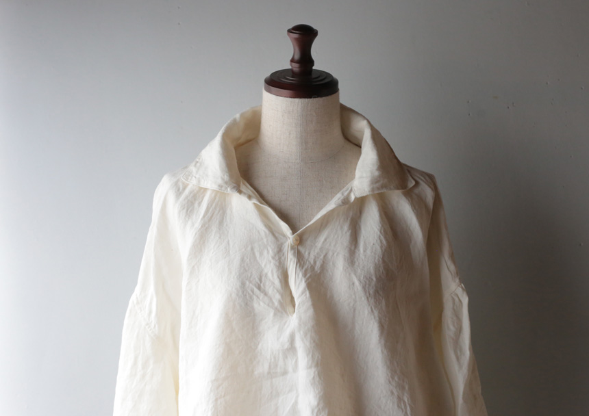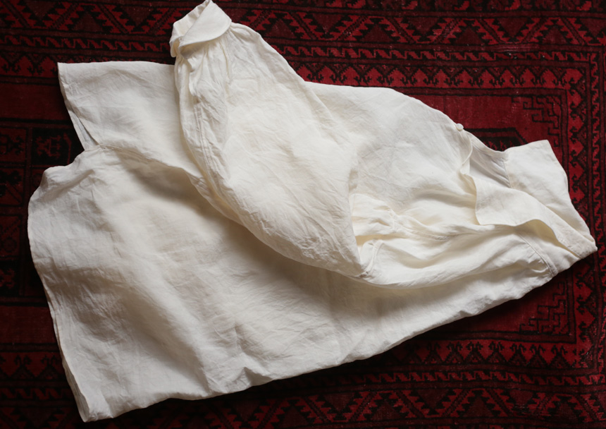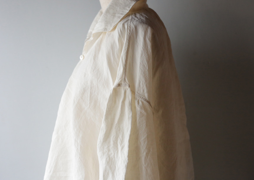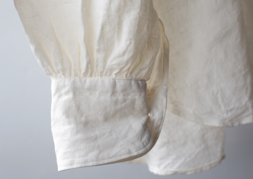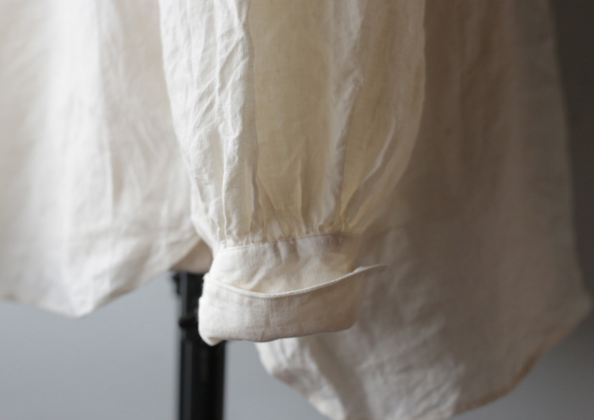 襟ぐり、袖ぐりにギャザーがたっぷり入った、18世紀頃のヨーロッパのシャツを元に製作しました。