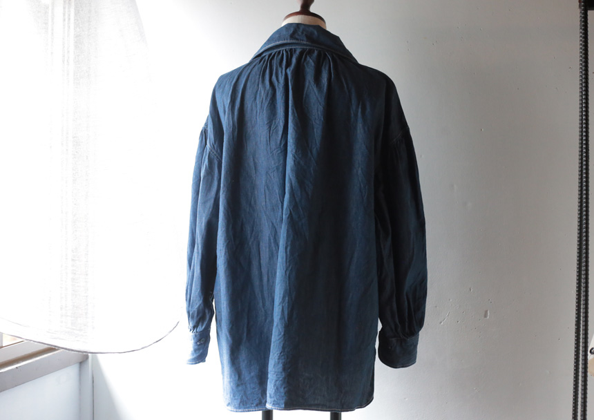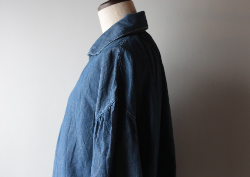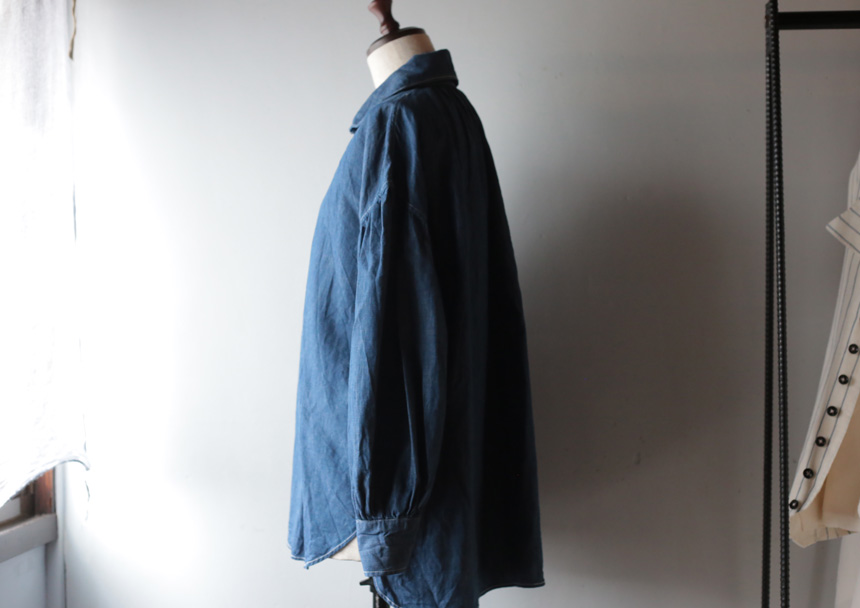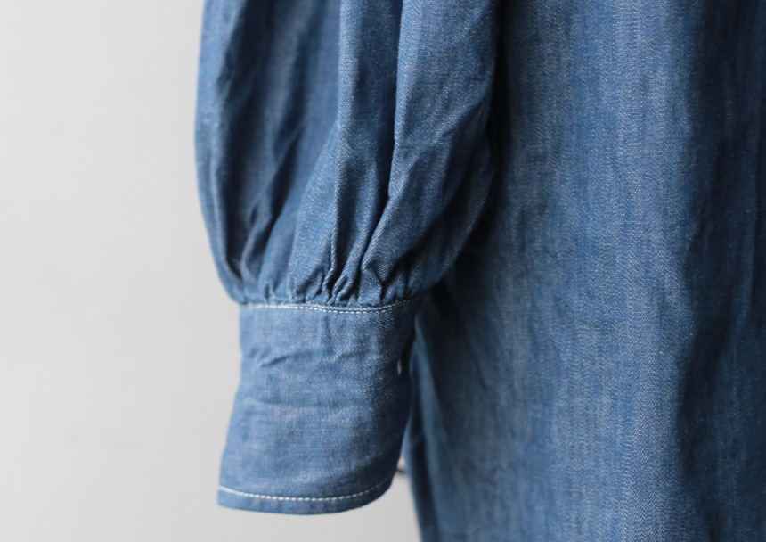 カフスのボタン位置を高くして、半分折り返すとターンナップカフスのように着ることもできます。 柔らかく仕上がるよう、古い足踏みミシンを使って縫っています。