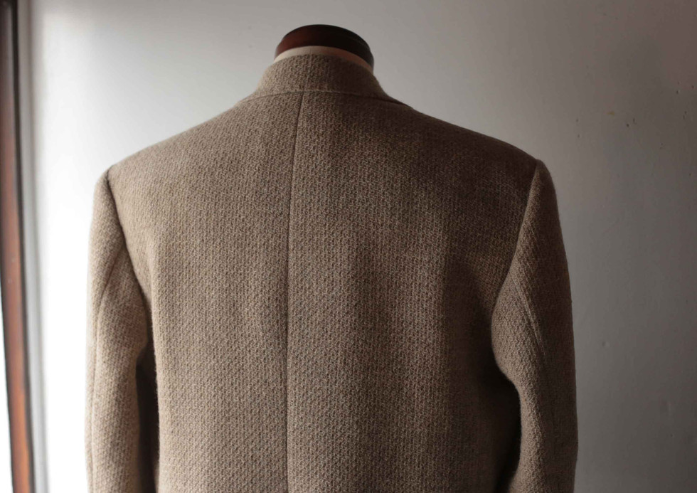 一見して柔らかい見た目ながら、ヘヴィツィードの厚みでしっかりとした質感があり、毛に残った油は水分を弾き、空気を多く含んでいるのでとても暖かく、まるで羊にくるまれているような一着になりました。