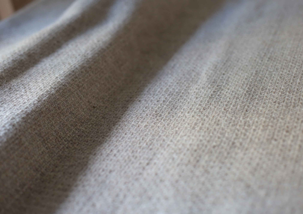 羊の毛の本来の風合いをそのまま活かすように、緩く撚ってローテーションで織られています。織りも特殊な織り方をしていて、他とは一寸違った柔らかい雰囲気を出しています。見る人が見ると分かる生地ですね。
