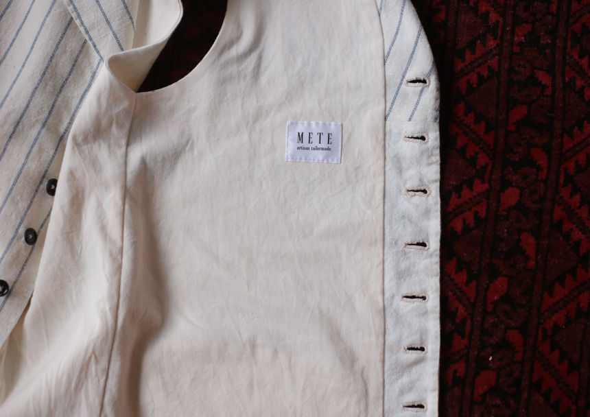 地縫いは強度を考えて手縫いではなく足踏みミシンを使用、ステッチは生地の雰囲気に合わせてハンドステッチ。ボタンホールは蝋引きした麻糸で手縫い。